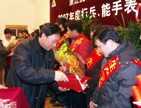 圖為公司副總經(jīng)理徐雄榮為能手頒獎(jiǎng)